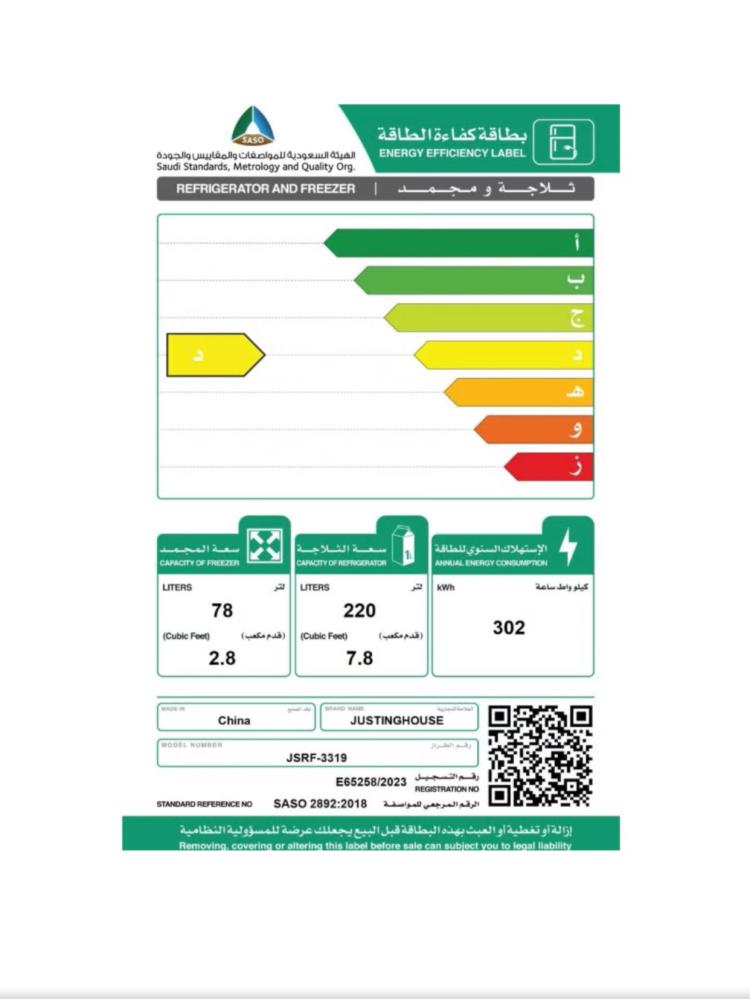 - كفاءة الطاقة: مستوى كفاءة طاقة D مع استهلاك سنوي قدره 302 كيلوواط/ساعة.